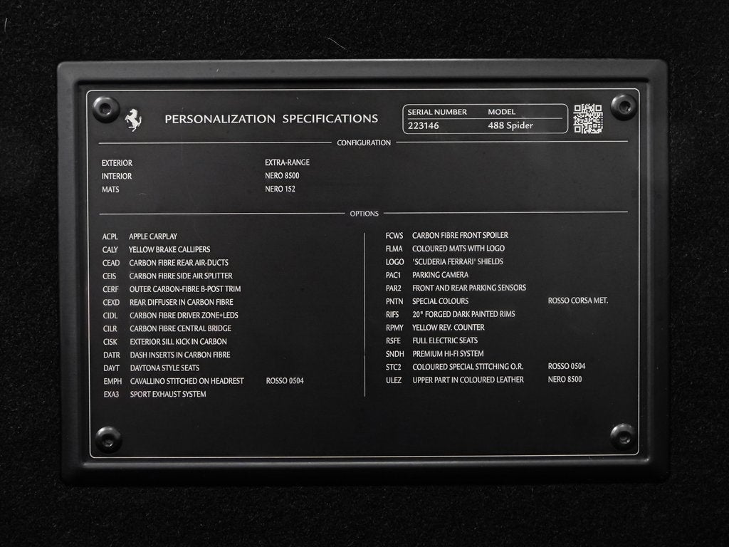 Performance: At the heart of the 488 Spider lies a 3.9-liter twin-turbocharged mid-mounted V8 producing an astonishing 661 horsepower at 8,000 rpm and 561 lb-ft of torque. Paired with a lightning-fast 7-speed F1 dual-clutch transmission, this open-top Ferrari launches from 060 mph in approximately 3.0 seconds. Featuring SCM3 magnetic suspension damping, Carbon Ceramic Brakes (CCM), Slide Slip Control (SSC), and Ferraris iconic Manettino steering wheel drive mode selector, the 488 Spider delivers razor-sharp handling, relentless acceleration, and an unmistakable Ferrari soundtrack intensified by its sport exhaust system.