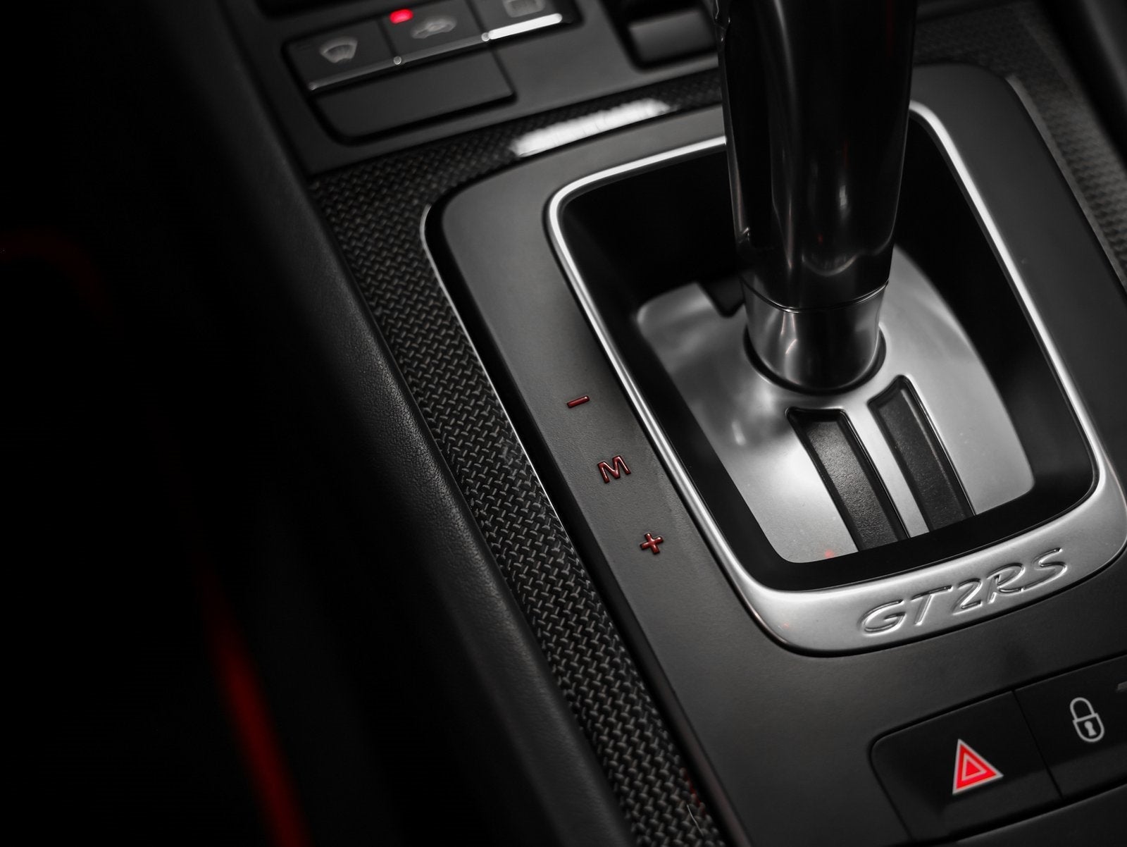The interior showcases a purposeful yet refined environment, highlighted by red contrast stitching, a 12 oclock red steering wheel marker, and white instrument dials and Sport Chrono stopwatch, all reinforcing the motorsport-inspired character of this GT2 RS. Carbon fiber details continue throughout, including illuminated carbon door sill guards and carbon window triangle trim, underscoring the cars lightweight focus.