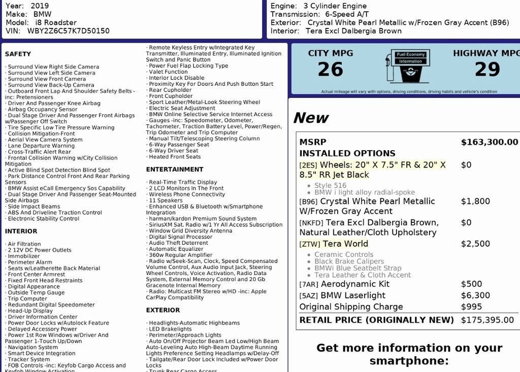 **Performance:** Powered by a turbocharged 1.5L 3-cylinder gasoline engine paired with an electric motor and a 6-speed automatic transmission, the BMW i8 Roadster delivers a combined **369 horsepower and 420 lb-ft of torque**. Its intelligent hybrid all-wheel-drive system, adaptive suspension, and regenerative braking provide lightning-quick acceleration, razor-sharp handling, and impressive efficiency, creating a truly unique driving experience.