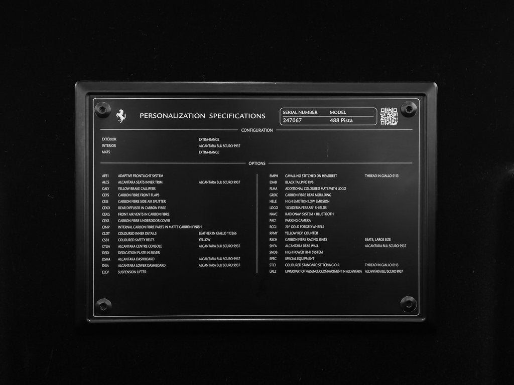 Performance: Powering the 488 Pista is a race-derived 3.9-liter twin-turbocharged V8 producing an exhilarating 710 horsepower and 568 lb-ft of torque. Paired with Ferraris lightning-fast 7-speed dual-clutch F1 transmission, the Pista accelerates from 0-60 mph in approximately 2.7 seconds. Advanced aerodynamics, Ferraris Side Slip Control system, and extensive weight-saving carbon fiber components deliver razor-sharp handling and extraordinary grip. The 488 Pista represents the pinnacle of Ferraris track-focused engineering, blending motorsport technology with road-going exhilaration.