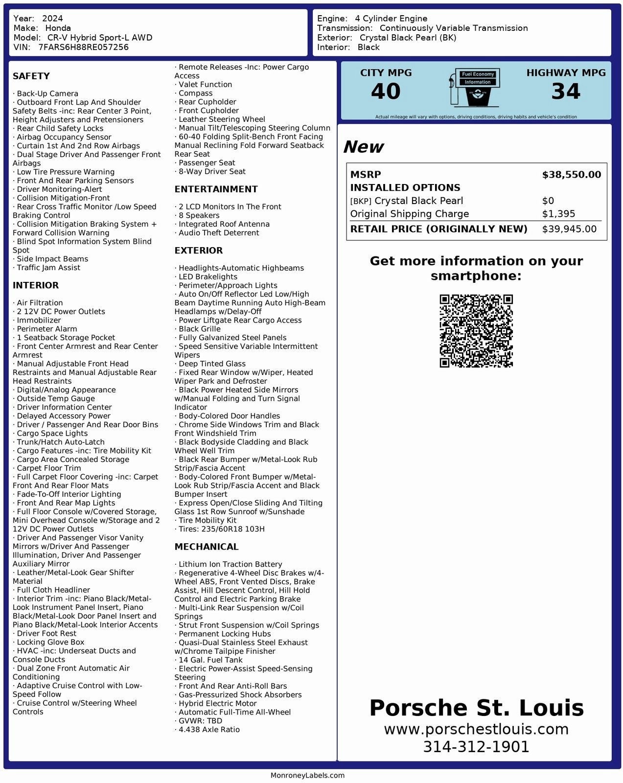 This 2024 Honda CR-V Hybrid Sport-L AWD represents a smart blend of efficiency, comfort, and modern safety technology, available now at Porsche St. Louis. This pre-owned vehicle has been carefully inspected to meet our high standards of quality and performance.